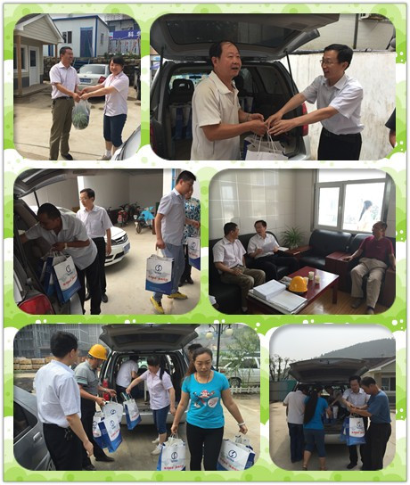 2015年6月26日上午,公司陈总、徐副总、人力资源部张主任一行,带着防暑降温物品来到我们汉峪金谷A1地块,看望和慰问了持续奋战在高温天气下的项目部同志们,给大家送来了阵阵清凉。接过公司领导送来的西瓜、绿豆和茶叶等物品,每一位员工的心里都暖乎乎的。