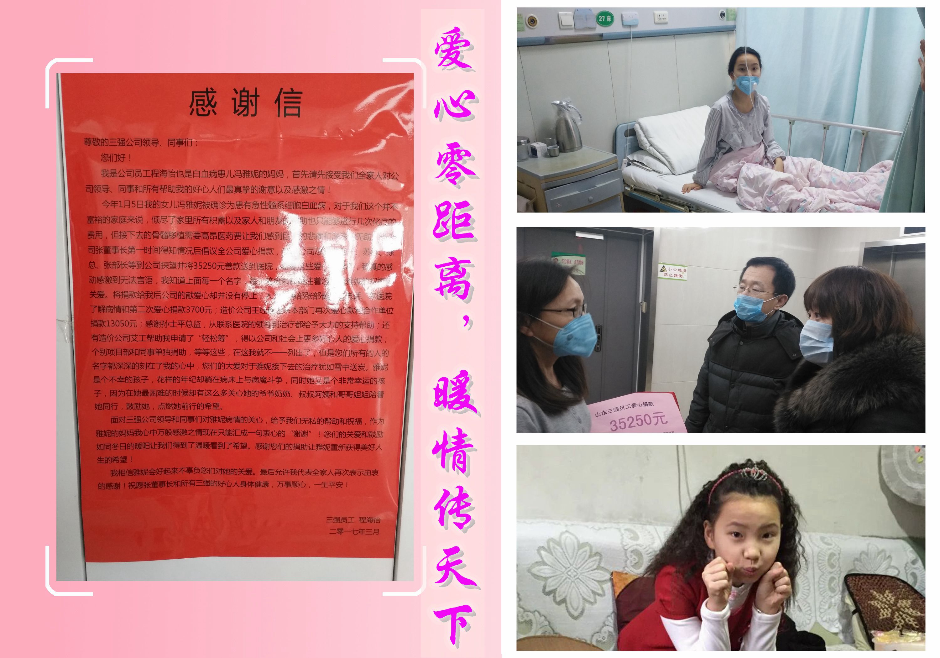 “爱心零距离,暖情传天下”。公司领导闻悉此情况后,于1月17日第一时间由公司党支部、工会联合发出“捐款倡议书”,号召全体“三强人”伸出援手,用我们爱的力量支撑孩子与病魔做斗争。“倡议书”发出后立即得到了全体员工的热烈响应,大家纷纷自愿捐款。公司领导更是率先垂范,带头捐款,短短几天便收到爱心捐款近3.6万元。1月23日上午,带着全体“三强人”的爱心,公司党支部、工会相关领导来到省立医院看望了程工及其病中的女儿,并亲手将“三强人”捐款送到程工手中。看着正在病床上打针的妮妮,我们几度哽咽。孩子啊,我们无法替你分担身体上的痛苦,但我们会在精神上永远支持你,用我们“三强人”的爱,给你加油,打气!“三强人”将一路与你同行!