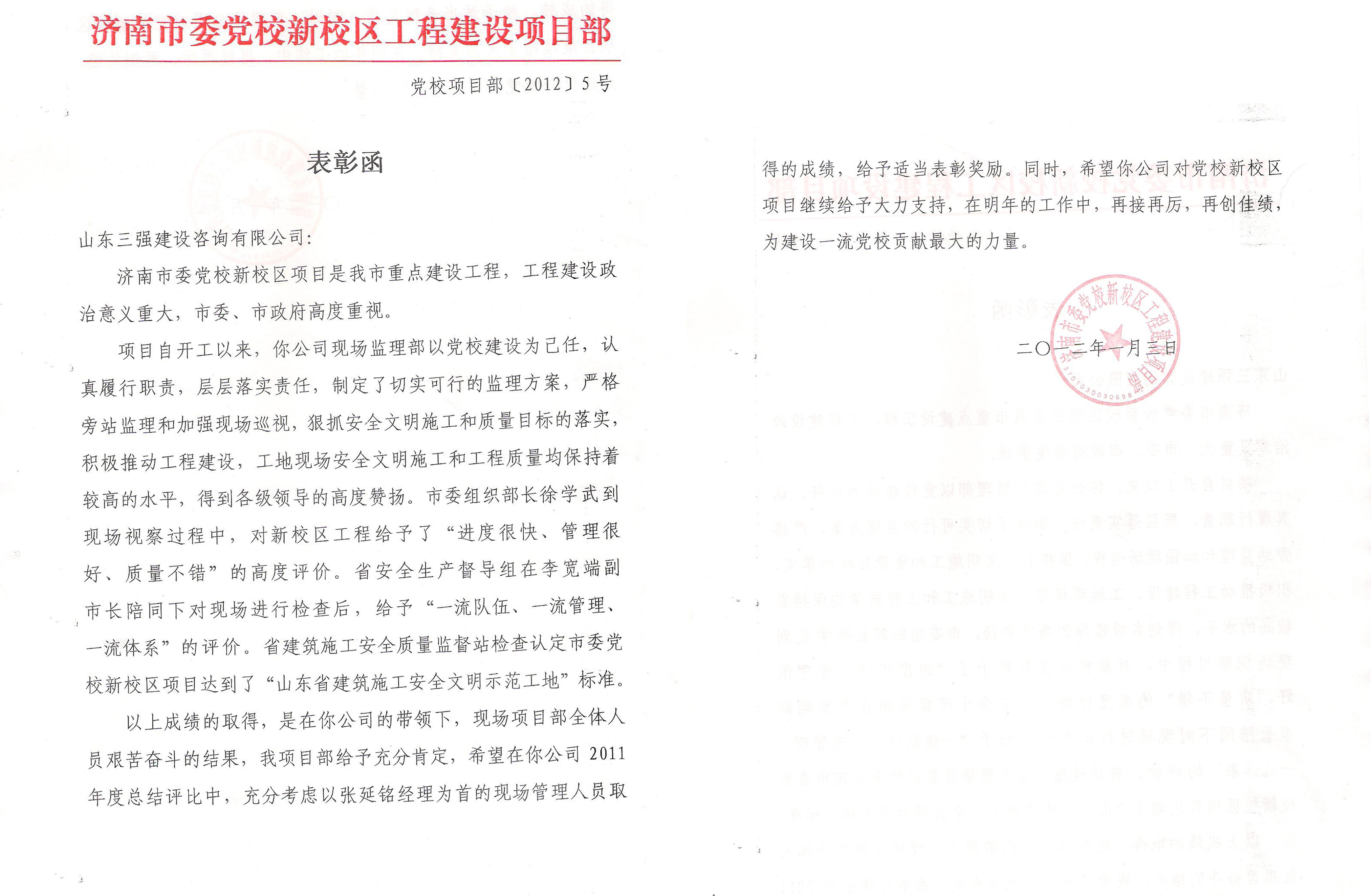 公司“济南市委党校新校区工程”项目部受到业主表彰