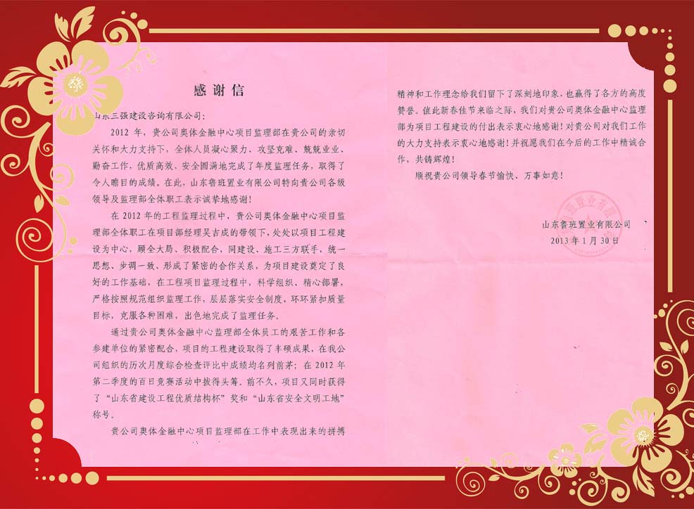 新春佳节即将来临,近日公司又收到山东鲁班置业有限公司一封感谢信。对我公司承揽监理的奥体金融中心项目,通过全体人员凝心聚力、攻坚克难、兢兢业业、勤奋工作,优质高效、安全圆满地完成了年度监理任务,取得了令人瞩目的成绩,表示诚挚地感谢。